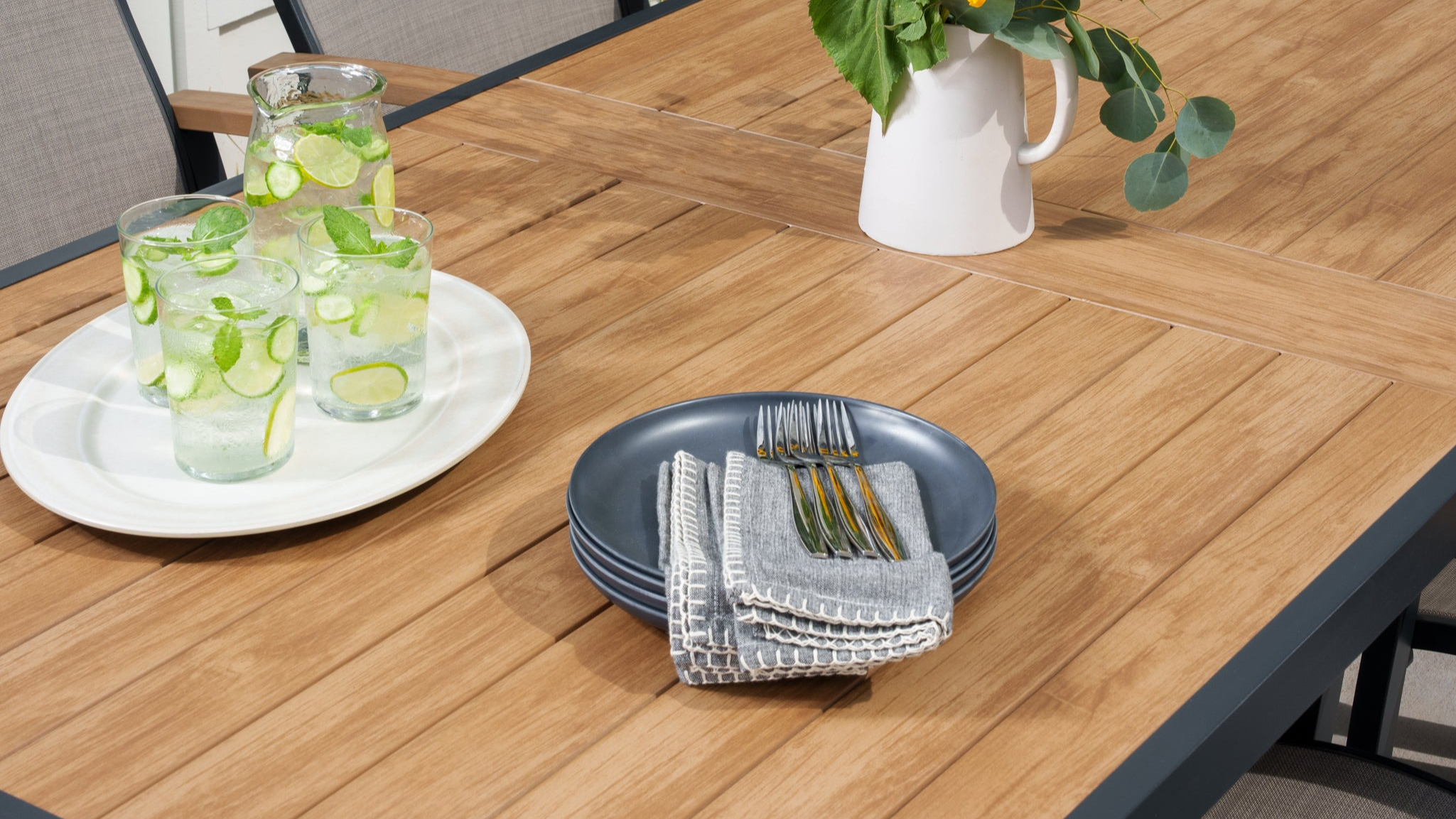 More fade- and warp-resistant, faux wood is designed to mimic real wood. It's a popular choice for outdoor patio furniture due to its weather-resistant durability, low maintenance, and often an eco-friendly choice for outdoor lounge, and patio dining sets.